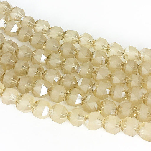 BeskrivningFacetterad, rund, frostad (i ett band på mitten) glaspärla i bruntHålstorlek 1 mmCa. 72 pärlor/sträng