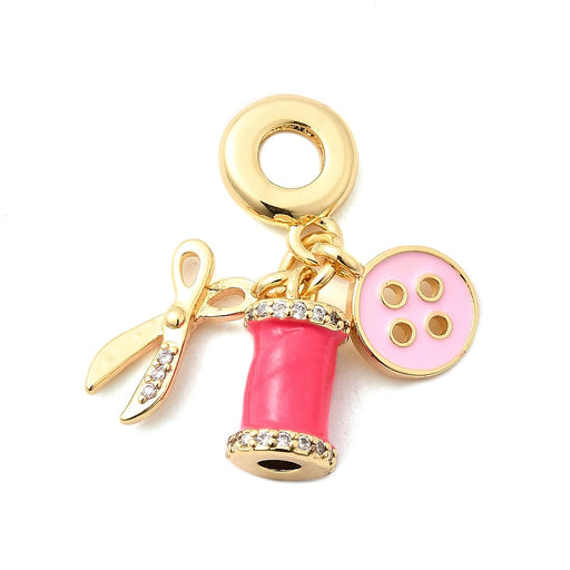 Hänge med trådrulle, sax och knapp, guldpläterat med 18K guld Mått 30 mm Hål 4,8 mm