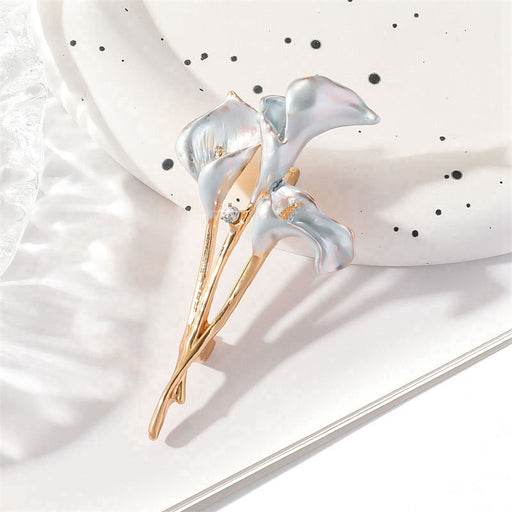 Brosch med 2 ljusblå liljor i emalj och rhinestone, guldpläterad Storlek 67x36 mm
