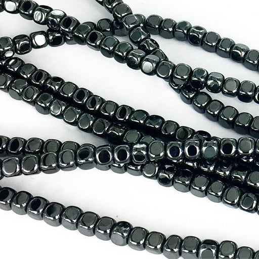 BeskrivningHematit kuber med rundade hörn. 4x4 mmHålstorlek 1 mmCa. 100 pärlor/sträng.